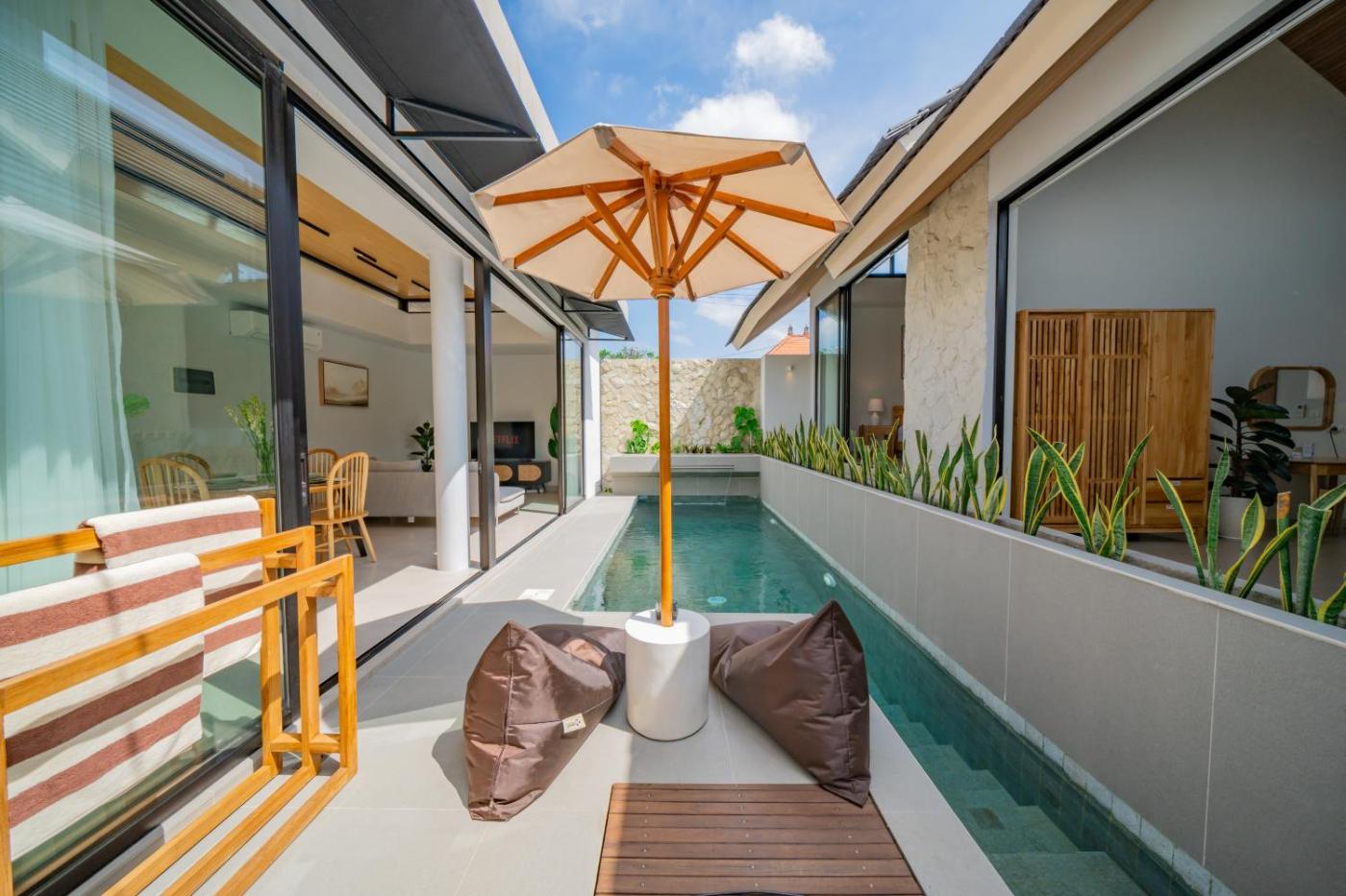 Located in Canggu, Umah Jerapah Canggu, Exquisite Brand New Villa 2BR - 10 minutes to Batu Bolong Beach provides accommodation with private pool, free WiFi and free private parking for guests who drive. The air-conditioned accommodation is 8.1 km from Petitenget Temple. The property is non-smoking and is9.1 km from Ubung Bus Station.
