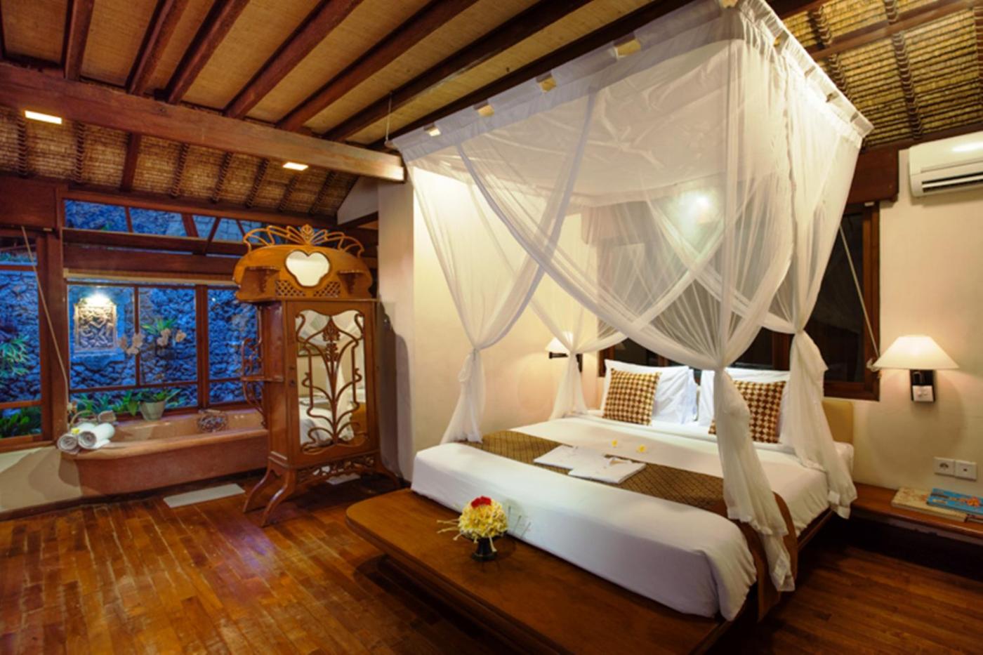 Shaded by tropical trees, each individual bungalow at Hotel Tandjung Sari is fully air conditioned and features traditional Balinese décor.rooms come with a minibar, fridge and seating area.